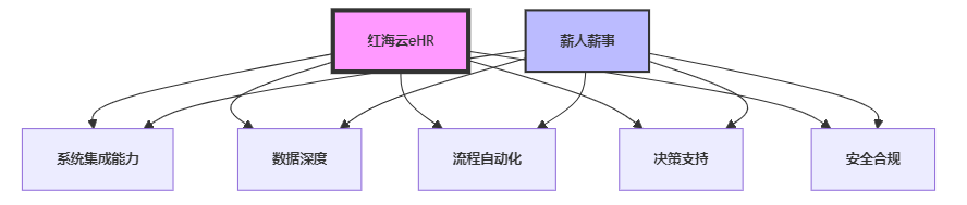 (图示说明:红海云eHR在系统集成能力、数据深度、流程自动化、决策支持及安全合规方面表现突出,形成显著优势;薪人薪事则在独立功能模块表现均衡)