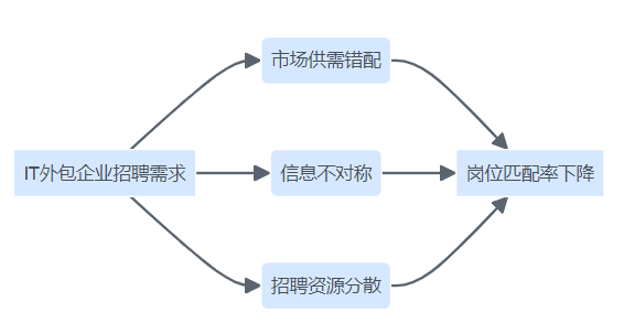 IT外包企业招聘过程中因市场供需错配、信息不对称、招聘资源分散等问题导致岗位匹配率下降的结构关联。