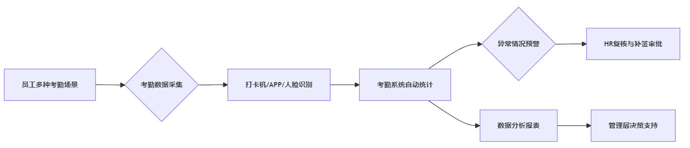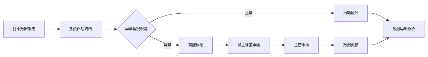 考勤数据处理流程图,呈现从数据采集、异常识别到补签与分析的全流程优化