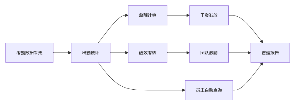 考勤数据与HR系统集成关系图,展示出勤统计与薪酬、绩效、员工自助等模块的业务联动