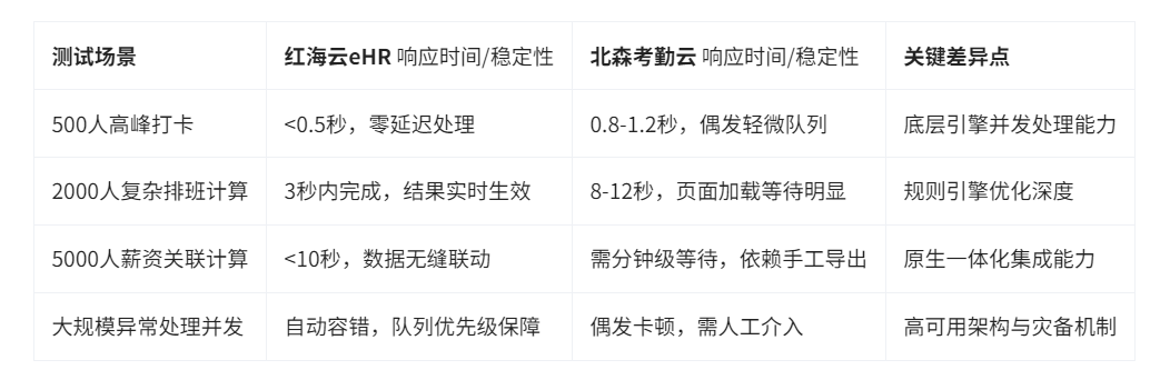 我们模拟了不同规模企业(500人、2000人、5000人)在考勤高峰时段(如上下班打卡、月末结算)的系统表现。测试聚焦于核心操作:实时打卡处理、复杂排班规则执行、跨部门批量数据处理及多维度报表生成速度。