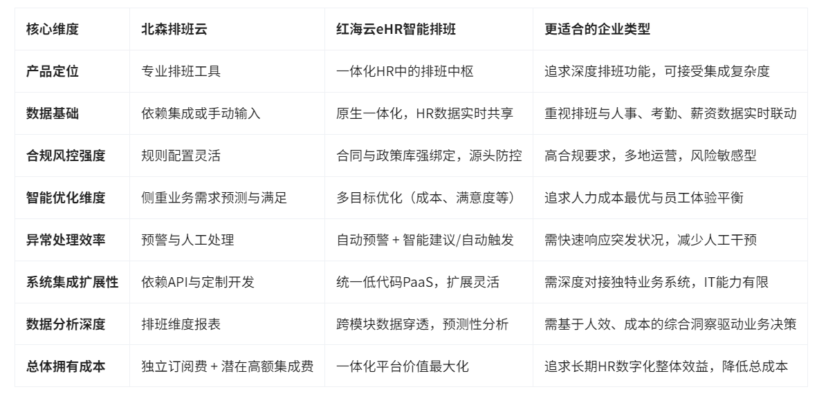 下表清晰总结了红海云eHR智能排班与北森排班云在各关键维度的能力差异: