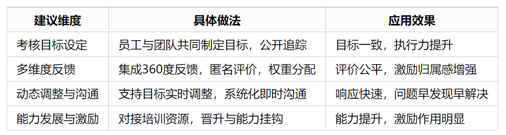 绩效工具落地建议表,展示各建议维度的具体做法及实际应用效果