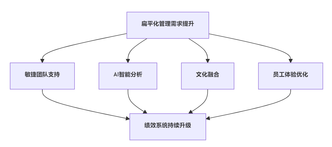 绩效考核系统发展趋势结构图,展示扁平化管理需求驱动下的四大发展方向与系统升级路径