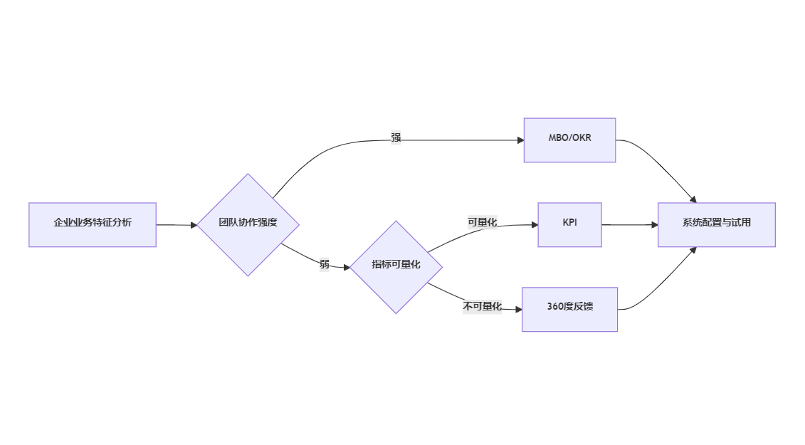 绩效考核系统选型流程图,展示根据协作强度和业务特征决定工具类型