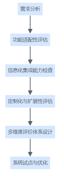 项目驱动型企业绩效管理系统选型流程图,展示从需求分析到系统试点优化的关键步骤。
