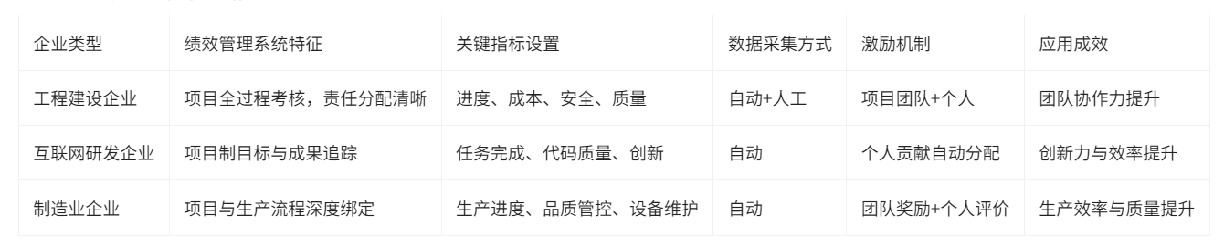典型项目驱动型企业绩效管理系统实践对比表,展示不同行业在系统应用中的关键做法与实际成效。