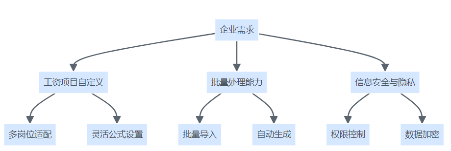 企业选择在线工资条系统的三大需求结构图,展示自定义、批量处理与安全合规三大核心要素。