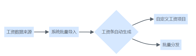 工资数据经系统批量导入与自定义规则后,自动生成工资条并批量分发流程图。