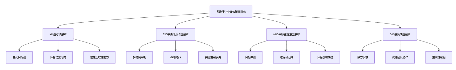 四类主流绩效考核系统与多维度企业需求连接结构图,显示各系统的适用特性及局限。