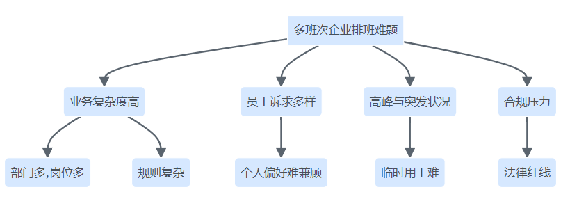 多班次企业排班难题结构图,涵盖业务复杂、员工诉求多样、灵活性受限、合规压力等四大板块