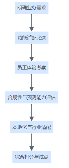 企业选型排班自动化系统的决策流程,从业务需求到功能评估、员工体验、合规与智能能力、本地化适配,再到综合评分和试点落地