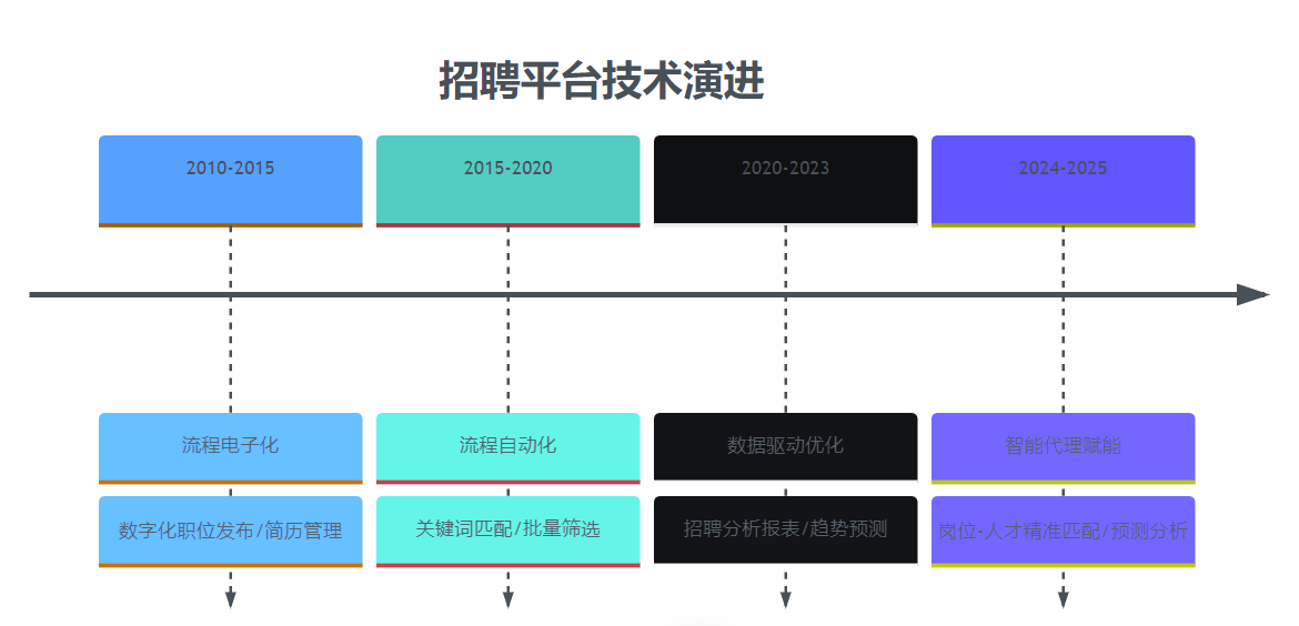 AI驱动招聘平台技术演进时间线:从流程电子化到智能代理赋能的四个阶段,展示技术与功能的演变过程。