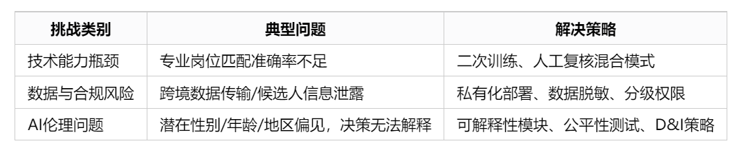 AI驱动招聘平台在技术能力、数据安全与伦理公平三个领域的挑战与解决路径对照表。