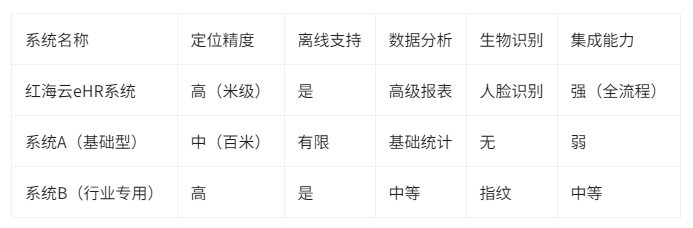 此表显示,红海云eHR在定位精度和集成能力上领先,特别适合外勤员工需要精确轨迹追踪的场景。系统A虽成本低,但离线功能薄弱,易导致数据丢失;系统B在特定行业表现不错,但生物识别仅支持指纹,不如人脸识别便捷。企业应根据外勤强度选择,高强度外勤首选高精度全集成方案。
