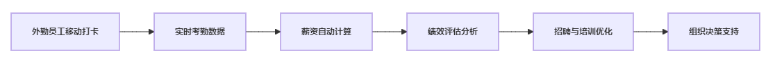 此流程图精要展示红海云eHR的数据驱动机制:从打卡起点,数据串联薪资绩效等模块,形成闭环生态。相比割裂系统,它消除数据孤岛,外勤考勤直接触发后续流程。例如,加班数据联动薪资计算,减少HR手动干预;绩效分析反馈招聘需求,优化外勤团队结构。企业借此实现人力全链条数字化。