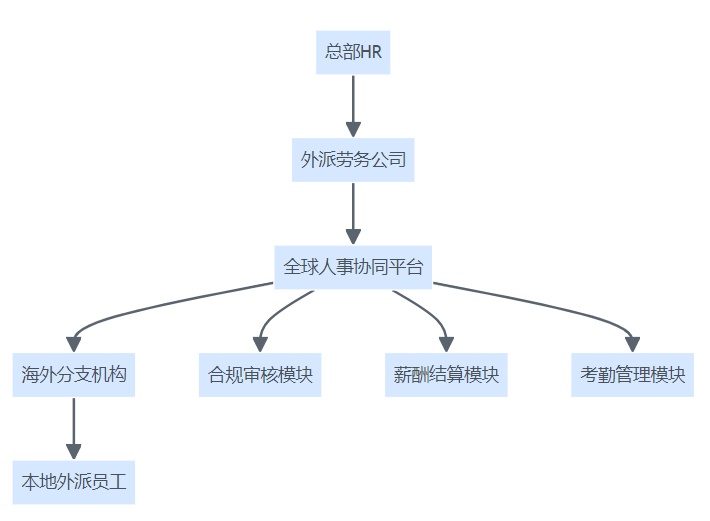 全球外派劳务公司与人事协同平台协作结构示意图,展示总部HR、外派公司、平台、海外分支、本地员工及系统功能模块间的关联关系。