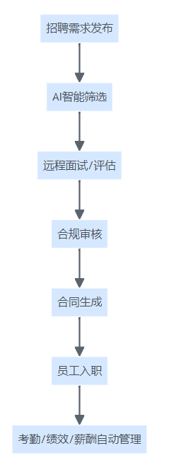 全球人事协同平台自动化管理流程图,展示从招聘需求到入职、考勤、薪酬等环节的智能化闭环。