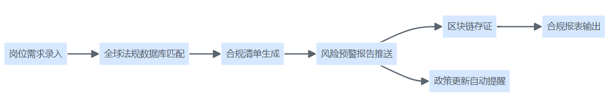 全球人事协同平台合规风险自动监控流程,涵盖需求录入、法规匹配、合规清单、风险预警与区块链存证。