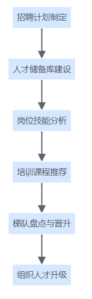 集团人才梯队建设与发展流程图,展示从招聘计划、储备库、技能分析、课程推荐,到梯队盘点和组织升级的全过程。