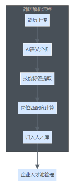 自动招聘管理系统的简历解析流程图,展示从简历上传到人才库归档的自动化过程。