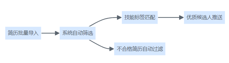 互联网企业技术岗位自动筛选流程图,展现从批量导入到优质候选人推送的全过程。