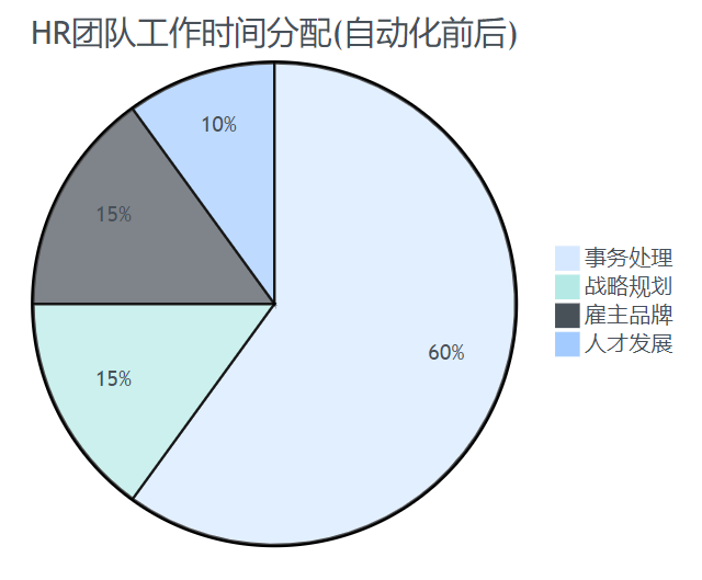 HR团队自动化前后工作时间分配饼图,显示自动化后战略与人才发展占比提升。