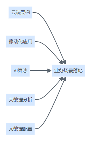 智能员工自助平台以云端架构、移动化应用、AI算法、大数据分析和元数据配置为技术核心,实现制造业多场景业务落地。