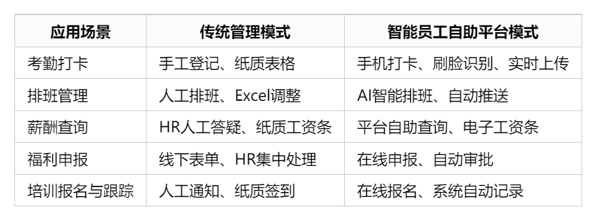 对比制造业企业传统HR管理和智能员工自助平台在考勤、排班、薪酬、福利、培训等场景的业务流程与效率提升。