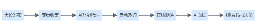 招聘系统智能化自动化流程图,展示从岗位发布到AI面试再到HR复核的全流程自动化路径。