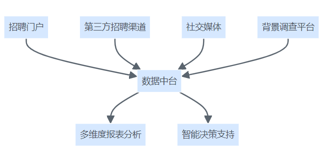 招聘系统多源数据集成结构图,展示数据从各平台汇聚到数据中台并支持分析与决策。