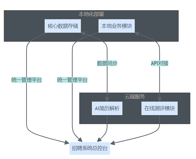 混合云与本地化部署招聘系统架构图,显示本地核心数据与云端AI模块的协同与统一管理。