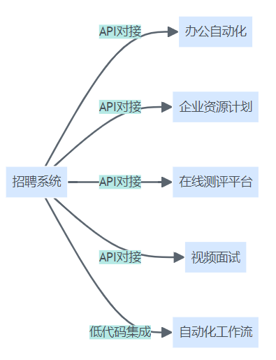 招聘系统API与低代码集成结构图,展现与多平台对接及自动化工作流设计。