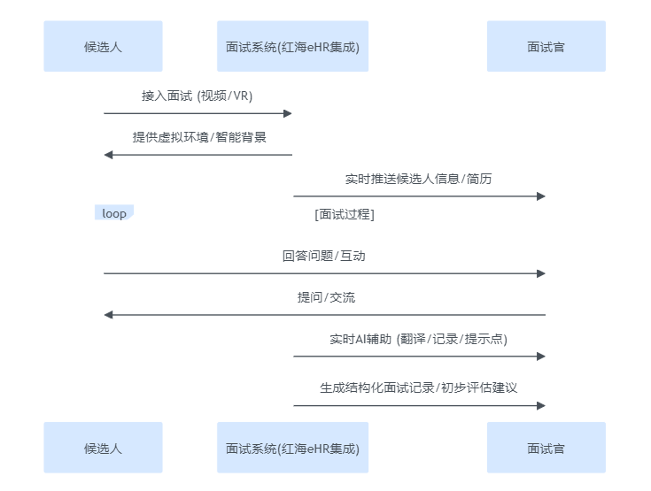 另一方面,对于更主流的视频面试,技术将致力于实现“无接触”的极致流畅体验。基于WebRTC的实时通信技术将更加稳定、低延迟、高保真,自适应网络状况,保障画面语音清晰。AI驱动的“智能面试辅助”功能将成为标配:实时语音转文字及翻译消除语言障碍;智能降噪和背景虚化/替换功能确保专业环境;基于微表情和语音语调分析的实时面试辅助工具(为面试官提供非主导性的参考建议,如关键点标记、潜在疑问提示),提升面试效率与客观性。红海eHR平台无缝集成了新一代的远程面试工具套件,支持多种模式的面试安排与管理(纯视频、VR接入、异步视频面试等),并提供强大的AI辅助功能,旨在为候选人创造便捷、舒适、有记忆点的面试旅程,也为面试官提供高效、可靠、深度洞察的评估工具,将远程面试的劣势转化为高效甄选的优势。