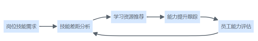 展示企业通过技能需求与员工能力评估,进行差距分析、学习资源推荐和能力提升跟踪的闭环流程。