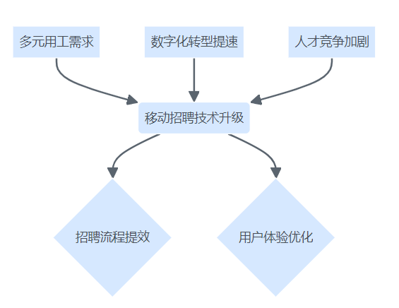 企业用工多元化、数字化转型与人才竞争三大驱动共同推动移动招聘技术升级,最终带来招聘流程提效和用户体验优化。