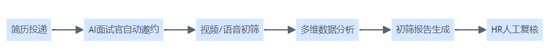 AI面试官从简历投递、自动邀约、视频/语音初筛、多维数据分析到报告生成及HR复核的全流程结构图。
