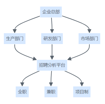 展现企业总部、各部门及多元用工形态通过统一招聘分析平台实现高效协同的结构关系图。