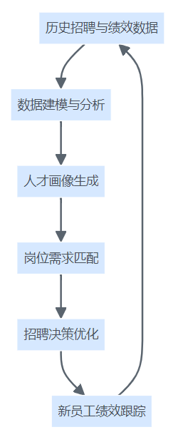 预测性招聘分析从历史数据建模、画像生成、岗位匹配到决策优化和绩效跟踪的全流程闭环结构图。