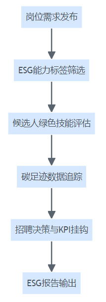 ESG与招聘效能分析从岗位发布、绿色技能筛选、碳足迹追踪到决策和报告输出的全流程结构图。