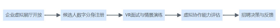 元宇宙虚拟招聘从展厅开放、数字分身注册、VR面试到协作能力评估和决策反馈的全流程结构图。