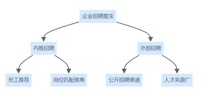 企业招聘需求通过内推招聘和外部招聘两条路径实现,内推侧重员工推荐与岗位匹配,外部侧重公开渠道与广泛人才来源。