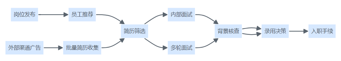 内推招聘流程相对精简,从岗位发布到录用决策主要依靠员工推荐;外部招聘流程标准化,涵盖广告发布、批量筛选、分阶段面试等多个环节。