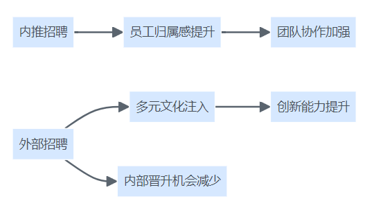 内推招聘强化员工归属感和团队协作,外部招聘注入多元文化、提升创新能力,但可能减少内部晋升机会。