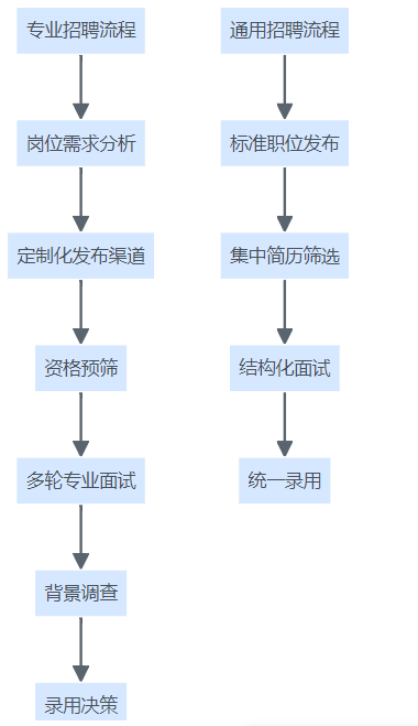 维度 专业招聘 通用招聘 选拔标准 专业能力、行业经验、项目 通用素质、基础能力、适应性 选拔流程 多轮面试、专业测评、实操 简历筛选、结构化面试 风险类型 人才稀缺、周期长、适应难 流动性高、适配度难 风险应对 储备人才、行业合作、推荐 流程优化、批量筛选