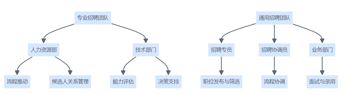 通用招聘团队则以人力资源部为主导,团队成员包括招聘专员、招聘协调员以及部分业务部门代表。职责分工更加标准化:招聘专员负责职位发布与初步筛选,协调员负责流程对接与沟通,业务部门主要参与面试和录用决策。由于通用岗位的要求相对宽泛,HR团队可以通过流程化管理实现高效协作。
