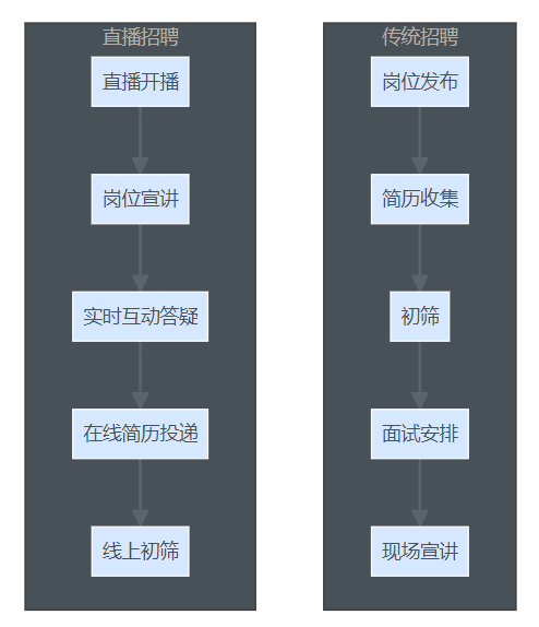 传统招聘流程和直播招聘流程对比结构图,展示两种模式下的信息传递与流程节点。