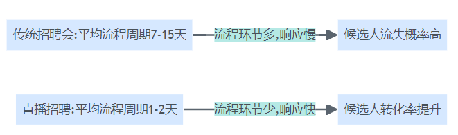 传统招聘与直播招聘在流程周期和候选人转化率上的效率对比图。