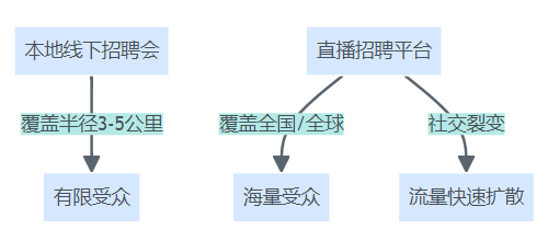 传统招聘与直播招聘在覆盖范围和流量获取上的对比示意结构图。