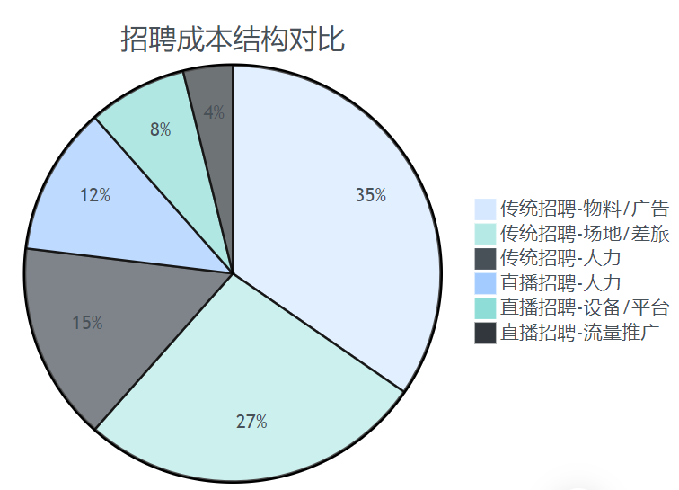 传统招聘与直播招聘在成本结构上的对比饼图,突出直播招聘资源投入更少。